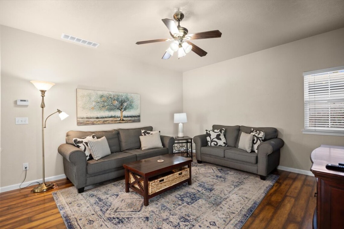 This property is a good sized single family home. You will have 3 bedrooms which include, 2 good sized living rooms, large patio and backyard to use during your stay. This is a townhouse style home, but there are no shared walls or areas, the garages are connected by a wall, but that is the only thing touching.